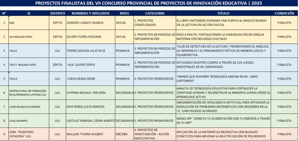 IMPORTANTE: Los Proyectos Finalistas socializarán sus proyectos de Innovación Educativa en el Auditórium de la UGEL Chucuito – 3er Piso el día Lunes 29 de Diciembre a horas 10:00 am, el mismo día se realizará el RECONOCIMIENTO a los maestros(as) innovadores.