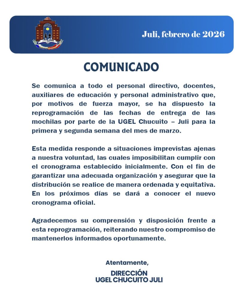 Sin categoría COMUNICADO: REPROGRAMACIÓN DEL CRONOGRAMA DE ENTREGA DE MOCHILAS. admin 2 semanas ago (Last updated: 2 semanas ago) 0 comments About the Author admin Administrator Visit Website View All Posts Post navigation Previous: PROCESO DE ADJUDICACIÓN, PUBLICACIÓN DE CUADRO DE MÉRITOS FINAL Y REPORTE DE FINAL DE PLAZAS ORGÁNICAS Y POR BOLSA DE HORAS VACANTES PARA EL PROCESO DE CONTRATACIÓN DOCENTE 2026 – PRUEBA NACIONAL.Next: SE COMUNICA A DIRECTORES DE LAS IIEEs EBR, EBE y EBA DEL ÁMBITO DE LA UGEL CHUCUITO EL INICIO DE DISTRIBUCIÓN DE MATERIAL EDUCATIVO DOTACIÓN 2026 Related Stories Sin categoría SIMON: REGISTRO DEL BIAE 2026 EN EL MARCO DE LA IMPLEMENTACIÓN DEL MONITOREO REGIONAL – FASE 2, DIRIGIDO A DIRECTORES Y PROFESORES COORDINADORES DE PRONOEI DEL ÁMBITO DE LA UGEL CHUCUITO, DURANTE LA SEMANA DE GESTIÓN Juan Antonio Montufar Argollo 8 horas ago 0 Sin categoría ASISTENCIA TÉCNICA PRESENCIAL (INFRAESTRUCTURA, ESTADÍSTICA, PATRIMONIO) admin 1 día ago 0 Sin categoría CONVOCATORIA A TALLER SOBRE ESTRATEGIAS, USO DE MATERIALES Y EL MODELO DE SERVICIO EDUCATIVO EIB EN EL NIVEL INICIAL Y PRIMARIA admin 1 día ago 0