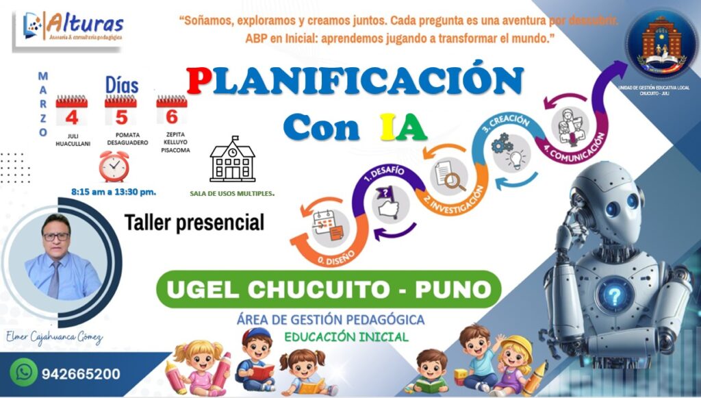 Sin categoría TALLER PRESENCIAL: PLANIFICACIÓN CON IA EDUCACIÓN INICIAL admin 1 semana ago 0 comments About the Author admin Administrator Visit Website View All Posts Post navigation Previous: Taller Descentralizado | Nivel Primario 2026 «PLANIFICACIÓN SIN LÍMITES CON IA: DOCENTES EN ACCIÓN»Next: Reporte de avance de los participantes que se encuentran desarrollando el curso «Habilidades para la interrelación con la comunidad educativa» (Corte 02.03.2026) Related Stories Sin categoría SIMON: REGISTRO DEL BIAE 2026 EN EL MARCO DE LA IMPLEMENTACIÓN DEL MONITOREO REGIONAL – FASE 2, DIRIGIDO A DIRECTORES Y PROFESORES COORDINADORES DE PRONOEI DEL ÁMBITO DE LA UGEL CHUCUITO, DURANTE LA SEMANA DE GESTIÓN Juan Antonio Montufar Argollo 7 horas ago 0 Sin categoría ASISTENCIA TÉCNICA PRESENCIAL (INFRAESTRUCTURA, ESTADÍSTICA, PATRIMONIO) admin 1 día ago 0 Sin categoría CONVOCATORIA A TALLER SOBRE ESTRATEGIAS, USO DE MATERIALES Y EL MODELO DE SERVICIO EDUCATIVO EIB EN EL NIVEL INICIAL Y PRIMARIA admin 1 día ago 0