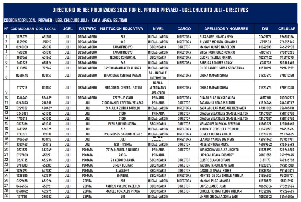 🚨🏫👩‍👩‍👧‍👦 ¡ LA UGEL CHUCUITO JULI EN COORDINACIÓN CON LA COORDINADORA LOCAL PREVAED PONE DE CONOCOCIMIENTO A TRAVES DEL OFICIO N°0054-2026 LA REALIZACIÓN DE LA CAPACITACIÓN E INDUCCION PRESENCIAL EN GESTIÓN DEL RIESGO DE DESASTRES PARA LAS 29 IIEE PRIORIZADAS POR EL PROGRAMA PP0068 2026 DE LA UGEL CHUCUITO, DIRIGIDOS A DIRECTIVOS Y DOCENTES RESPONSABLES EN GRD ! 🏫👩‍👩‍👧‍👦 🚨