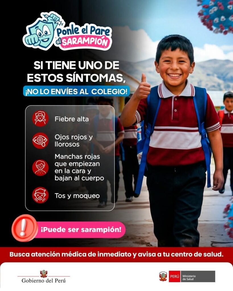 • Sensibilizar a los padres de familia y alumnos para la aceptación de la vacunación y permitir el ingreso de las brigadas para la vacunación contra enfermedades inmunoprevenibles (la vacunación contra el sarampión se ha extendido hasta los 10 años 11 meses y 29 días, en el marco de la alerta sanitaria).